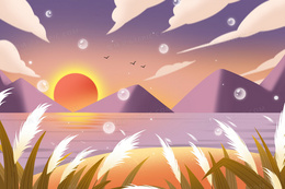 > 可爱女孩秋日傍晚在芦苇丛看日落插画