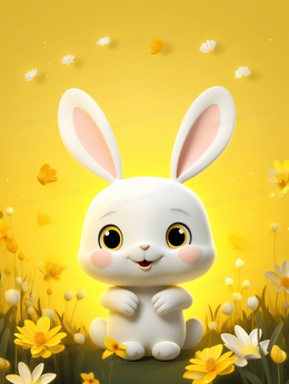 金色小雏菊花丛中的小白兔可爱卡通插画