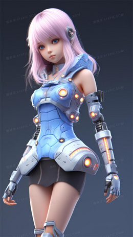 漫画风可爱的粉色头发机甲女战士3D模型