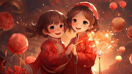 春节乡村里一起放烟花得两个女孩插画