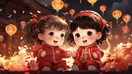 红色春节两个小女孩赏花灯插画