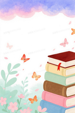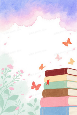 蓝紫粉渐变水彩云层植物蝴蝶书籍背景