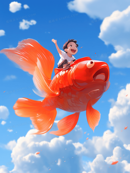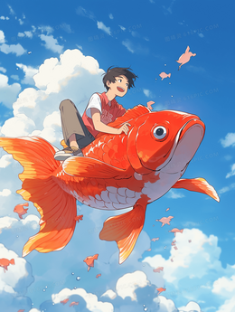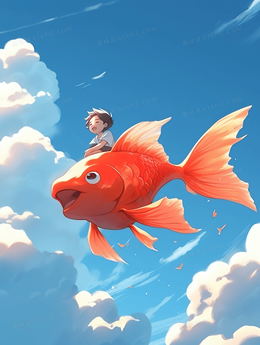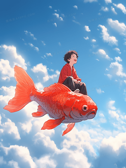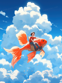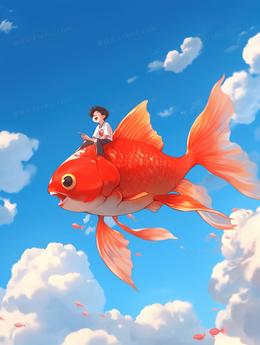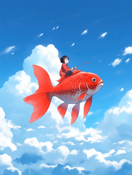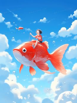 骑在幸运锦鲤上的儿童翱翔天空插画