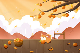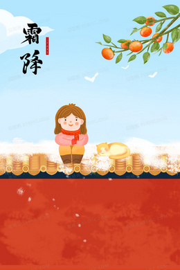 二十四节气霜降女孩带小狗摘柿子秋季插画