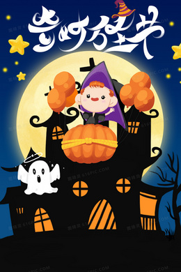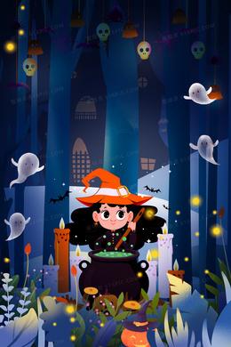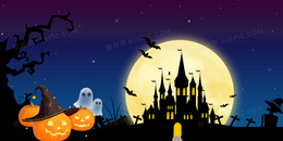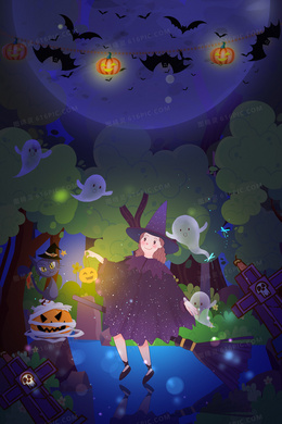 红色夜晚月亮树木诡异风景卡通手绘万圣节插画背景