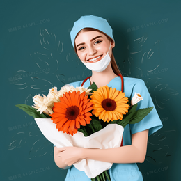 护士穿着蓝色工作服手捧鲜花开心的笑