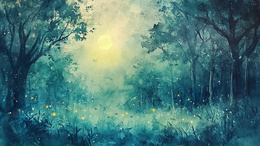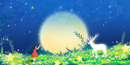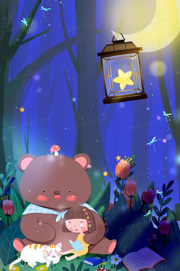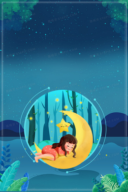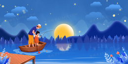 手绘插画风夏夜父女游船钓鱼清凉背景