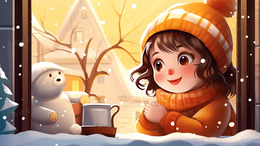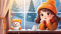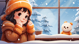 冬季窗户旁看雪戴着针织帽的女孩插画
