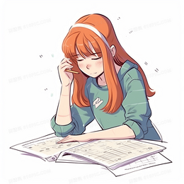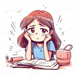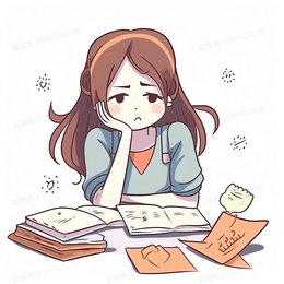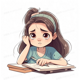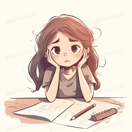 可爱卡通女孩对着作业一脸痛苦无从下手
