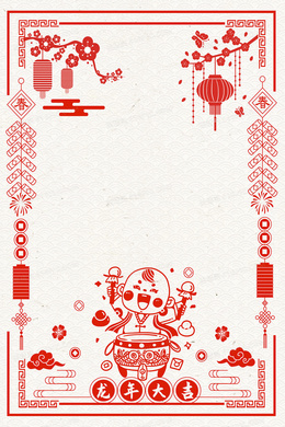 新年2024年龙年剪纸风龙年大吉敲锣打鼓梅花边框背景