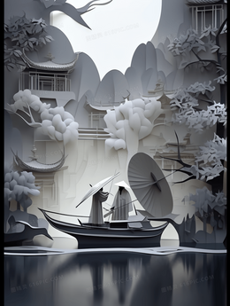 中国风立体浮雕建筑山水风景插画
