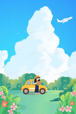 女孩自驾查地图户外风景手绘插画