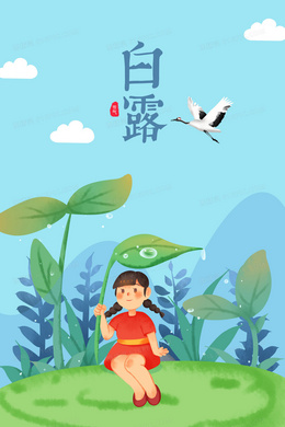 白露女孩坐在草坪上接露珠手绘插画