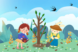 春天小女孩和小兔朋友一起植树手绘插画