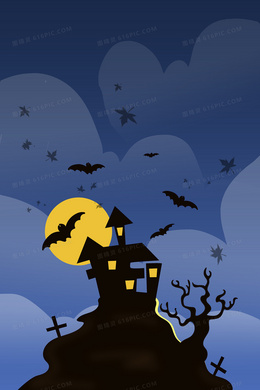 蓝色夜晚手绘万圣节插画卡通背景素材
