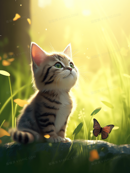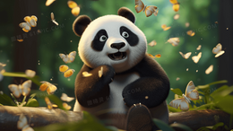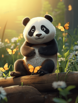 卡通大熊猫在森林与蝴蝶玩耍插画