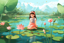 炎热夏天可爱的女孩坐在开满荷花的池塘中的莲叶上