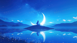> 蓝色夜空坐月亮的女孩背景