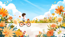 > 夏日夏天可爱小孩子骑自行车田野户外风景插画