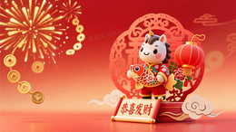 卡通渲染新春主题右侧Q版小马穿牡丹纹对襟袄抱鲤鱼灯笼