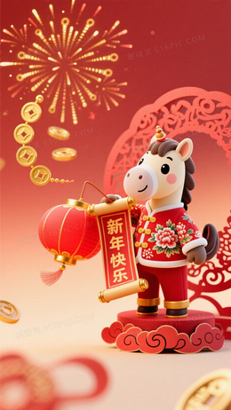 卡通渲染新春主题右侧Q版小马穿牡丹纹对襟袄拿着一个红金灯笼