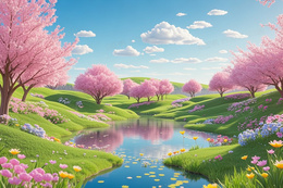 3D渲染绿色山丘前景中有一个小湖和一些花朵