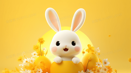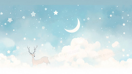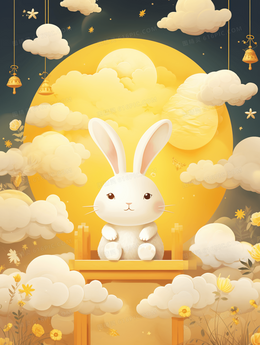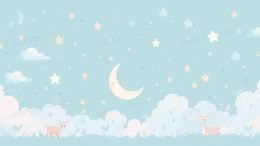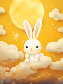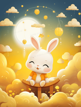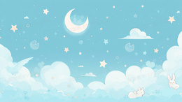 > 淡蓝色背景月亮下的卡通小白兔插画