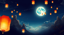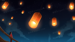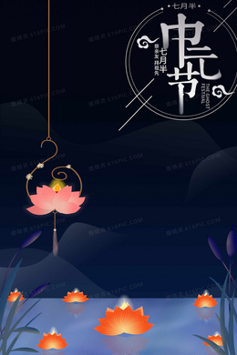 中国风中元节古建筑孔明灯河灯祭祀背景