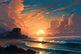 蓝色夏日夜晚大海月亮剪纸风手绘插画背景素材