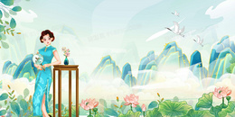 > 复古中式旗袍美女插画背景