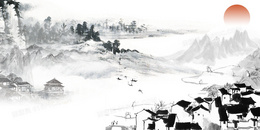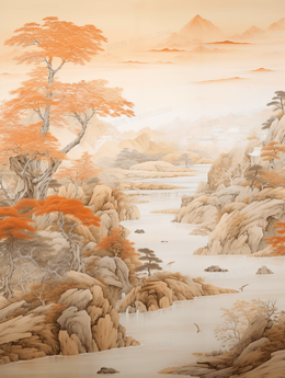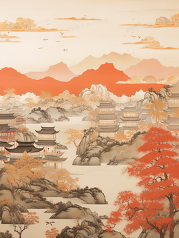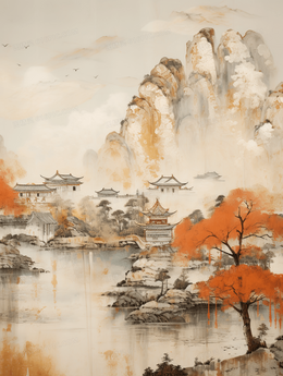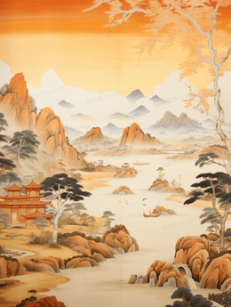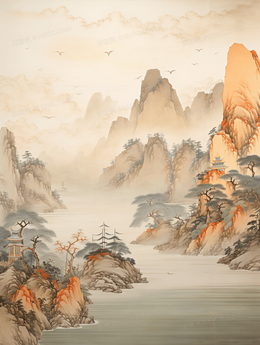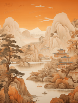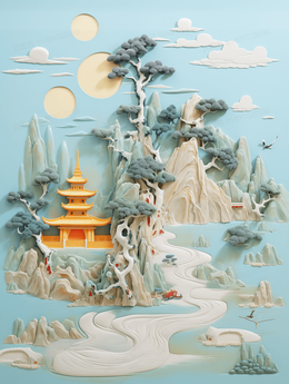 蓝色立体浮雕中国风山水树木建筑风景插画