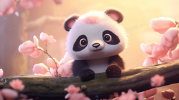 在粉色花朵中的大熊猫宝宝可爱逼真插画