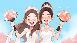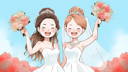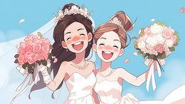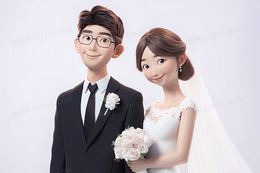 韩式唯美新郎和拿着捧花的新娘在微笑婚纱照3D模型插画