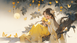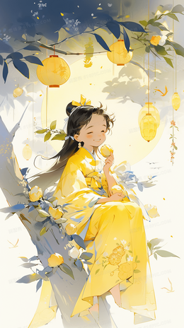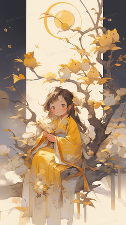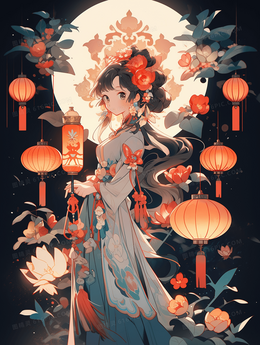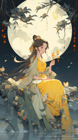 > 美丽的古风少女在月亮下抱着自己做的糕点庆祝节日创意插画