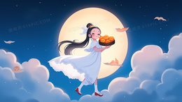 美丽的古风少女在月亮下抱着自己做的糕点庆祝节日创意插画