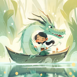 端午节可爱的女孩和一条巨龙开心的划船游湖创意插画