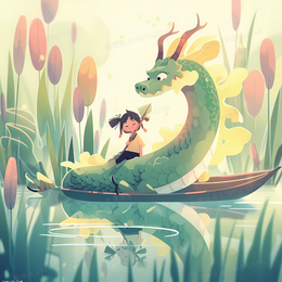 可爱的小女孩和一条巨龙开心的划船游湖端午节插画