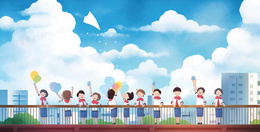 毕业季校园内教学楼学生站在围栏挥舞插画