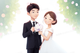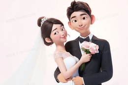 卡通唯美新郎揽着手拿捧花的新娘婚纱照3D模型插画