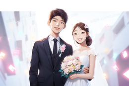 韩式唯美新郎和拿着捧花的新娘在微笑婚纱照3D模型插画