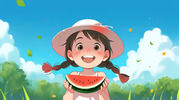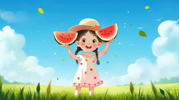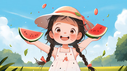 > 快乐童年吃西瓜的小女孩插画
