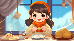 冬天下雪天在家吃美食的小女孩插画