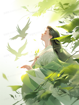 唯美雨滴中的卡通女孩雨水节气插画