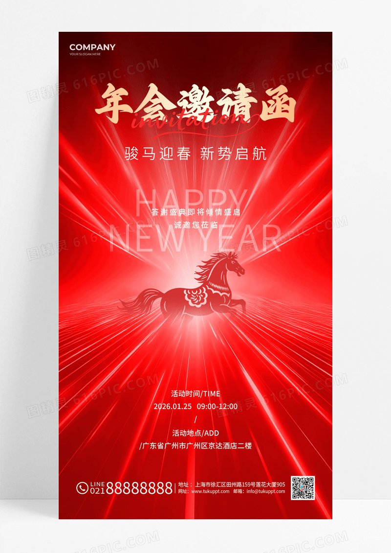 当前位置: 图精灵 > 设计模板 > 新媒体 > 红色马年剪影2026马年新年快乐年会邀请函海报