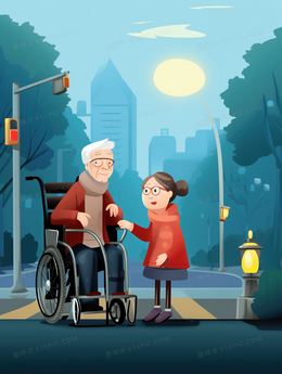 青年帮助推残疾人过马路插画