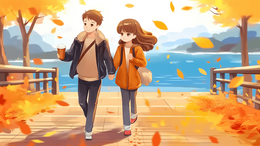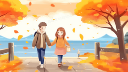 秋天牵手走在落叶纷飞大道上的情侣插画