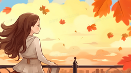 > 秋天金色落叶纷飞围栏边的女孩插画