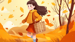 秋天金色落叶纷飞的树林里拿着篮子的小女孩插画
