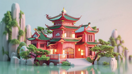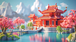 > 一幢可爱的积木风中国宫殿插画