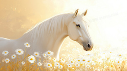 阳光下的白色骏马与花卉背景